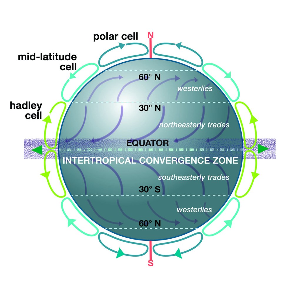 We sail on to a grislier reality: the horse latitudes. Almost as grisly, we fetch up against the physics of convective currents arranged around the earth like turning bands: cold air falls and warmer air rises, and the surface winds that are generated by these vertical drivers arrange themselves in three ranks, from the equator to the poles. They’re called cells, and each has a designation: polar, mid-latitude, and Hadley cells. Think three dimensionally of these rolls of air moving up and down – and laterally, due to Coriolis and other global forces. These lateral surface movements are our trade winds, that can change locally and weekly but may be trusted seasonally.