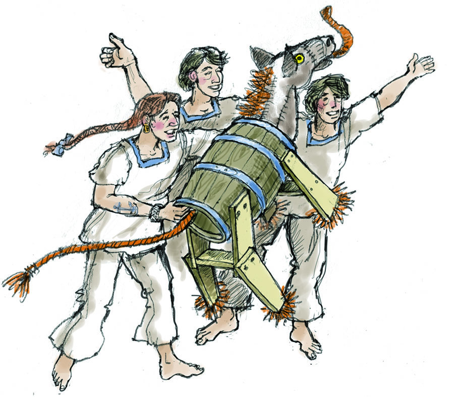 One happy shipboard occasion was the end of the dead-horse month, when the jolly tars would be working for themselves, again. (Note math deficits, above.) On that lucky day, sailors cobbled up a horse from scraps of canvas and wood, stuffed with straw from sheep and pig mangers, and threw the dead horse overboard! Free at last!