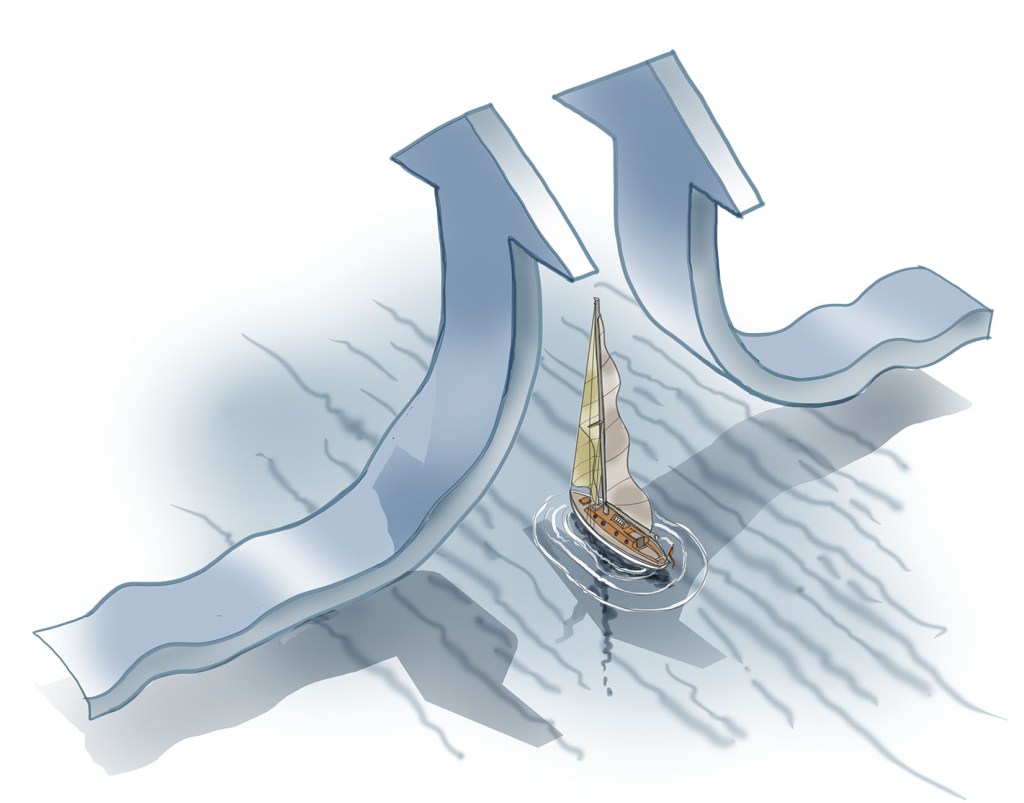Consider the north and south Hadley cells sweeping toward the equator. These enormous volumes of air meet and rise. In the cusp between the north and south cells, the converging air, rising, creates a troublesome band of calms without regular winds. A vessel heading between the northern and southern hemispheres must cross this frequently windless barrier and may drift without a breeze for days, weeks. This intertropical convergence area is called the doldrums. In the age of sail, waiting for a breeze to propel your vessel to reliable trade winds could be an unpleasant trial.