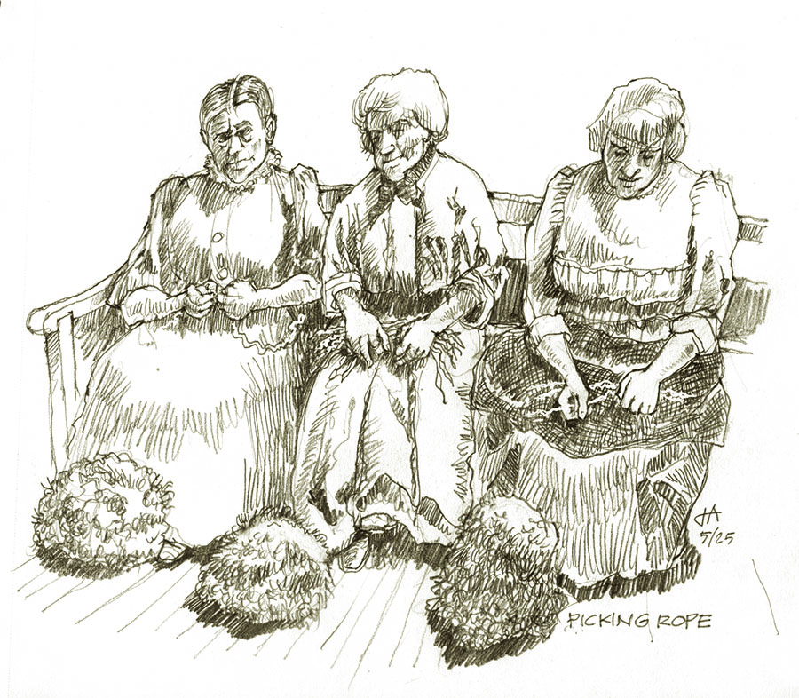 Don’t despair quite yet. There is a time-honored remedy: caulking. A caulker blessed the barkie with resistance to water by using a caulking iron to drive fibrous material into the spaces between planks. When the fiber expanded with moisture, the hull became watertight. The fiber source varied – cotton, hemp, jute, &c. The traditional caulking was oakum (from Old English acumbe, “off-combings”): hemp fiber mixed with tar. The main source of oakum was aging hemp rope. Rope beyond its safe usage, carrying tar from its uses aboard, could be “picked,” disassembled by strands, yarns, and down to the fibers. This was fussy, slow work with little profit. Yet oakum was in constant demand, so its production became a major occupation in poor houses and prisons. Criminals, old folks, the destitute and their families picked rope.