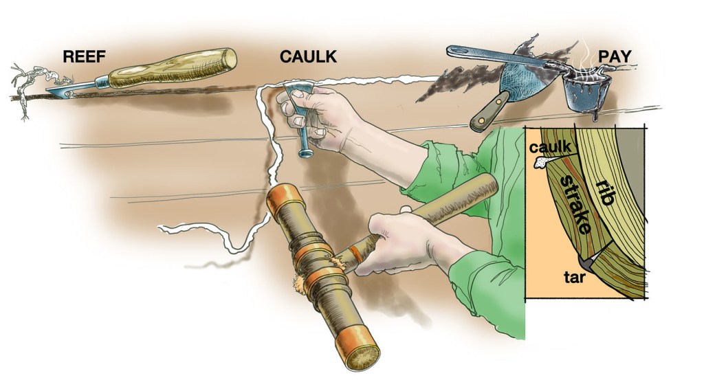 Caulkers in the boatyard readied a new vessel for service. Take even a well-seasoned boat through a lively storm, however, and leaks appear! The formidable forces of the boat’s mast/s versus its structure, and the uneven pounding of irregular waves, wracks and deforms the hull. Unsurprisingly, the hull can spit out its oakum and integrity is compromised.