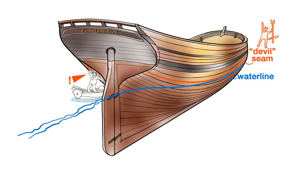 This has been sailor work for thousands of years, inevitable, commonplace. There is one seam, however, worse than all the others. It is the longest seam the barkie offers, running from the cutwater, curving down toward the waterline amidships, and rising toward the stern of a larger vessel right up under the poop, where a rogue wave could slam a hard-working sailor and his jolly boat up against the overhang of the hull.