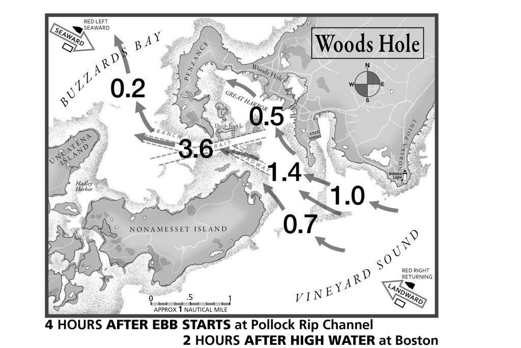 Passing through Woods Hole with or against the tide (the latter is safer), is never a lark. Every mariner I know has taken that passage in the fear of God and after reminding himself that the red marks will not be on his right as he enters from Buzzards Bay (convention stipulates red-right-returning operates offshore to inshore, so the nuns are on the north sides of the channels). The displacing, treacherous currents at moon tide suck Number 3 under the water and tosses it back and forth like a toy so it boils up over there, then over here toward your hull. You can glimpse killer rocks shooting past under the surface with red, blue, and green smears of bottom paint on their granite faces. You can know the Hole like your way to the toilet in the middle of the night but the Prudent Mariner has the chart (another vanishing item) laid out beside the wheel every time. In the midst of this maelstrom, trying to focus on your hand-held iPhone is contraindicated.