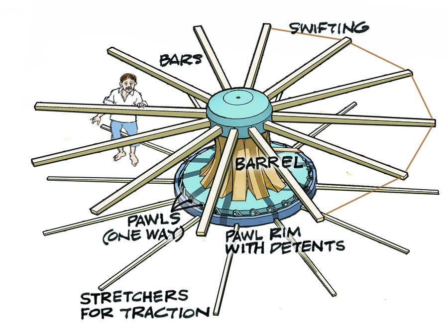 12 bars, 3 men per bar (for simplicity I’ve shown only one per bar), 36 burly sailors using their whole bodies to walk the capstan around. Now add another 36 sailors, because a duplicate capstan fixed to the same “axle” spindle is operating one deck below, twice the power.