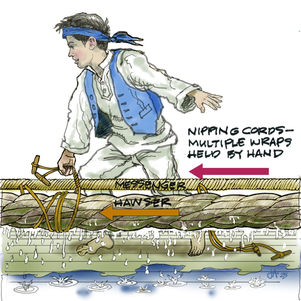 On the upper deck a 10” hawser won’t wrap around the capstan barrel; it’s too thick, stiff, it won’t bend enough. Solution: the messenger [I], a strong but thinner line wrapped several times around the capstan’s barrel., The messenger is spliced as an endless loop that runs forward from the capstan barrel to a turning block and back to the capstan. Every few feet a pair of light cords [J] are spliced into the messenger.